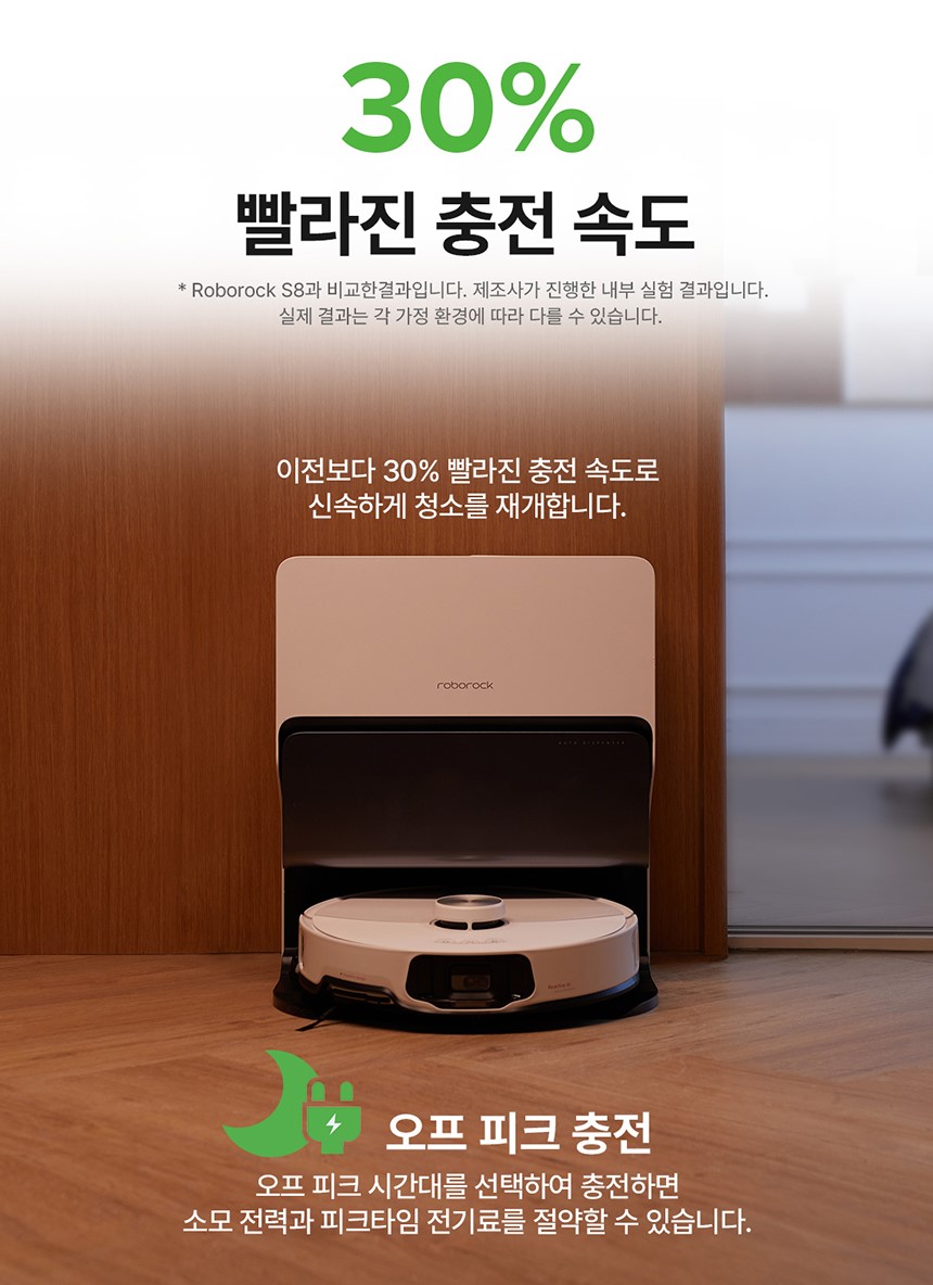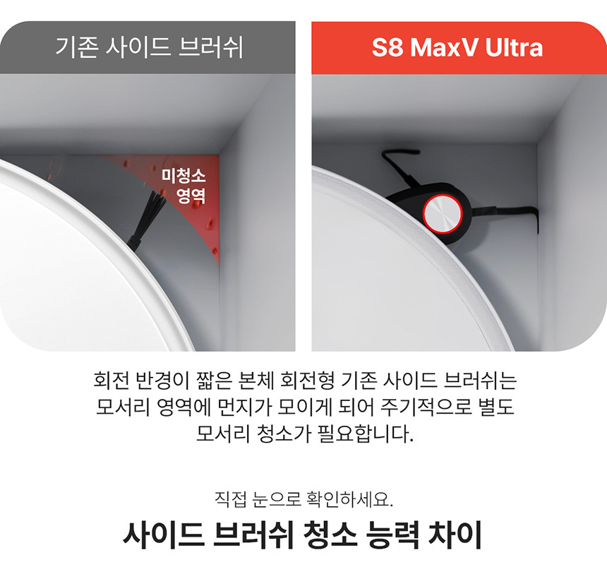 일반 로봇청소기는 둥근 모양 때문에 벽면이나 가구 모서리까지 청소하기 어려웠습니다. 하지만 로보락 S8 MaxV Ultra는 사이드 엣지 물걸레가 추가로 내장되어 있어, 메인 물걸레가 닿지 않는 구석까지 꼼꼼하게 청소해 줍니다.