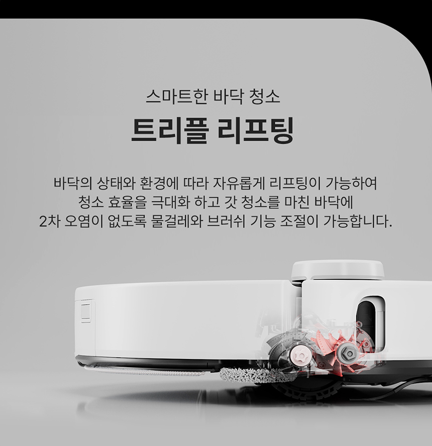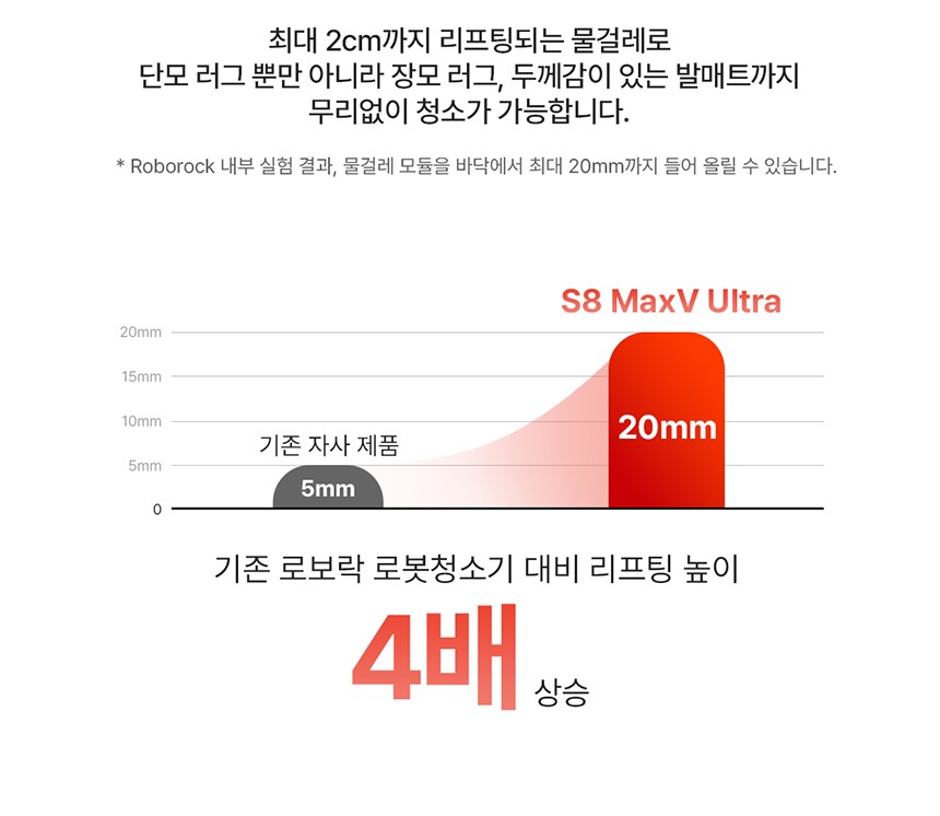 로보락 S8 MaxV Ultra는 트리플 리프팅 기능을 통해 바닥의 상태에 따라 물걸레를 최대 2cm까지 들어 올릴 수 있습니다. 카펫이나 러그를 만나면 자동으로 물걸레를 들어 올려 젖지 않도록 하고, 흡입력을 높여 먼지를 제거합니다.