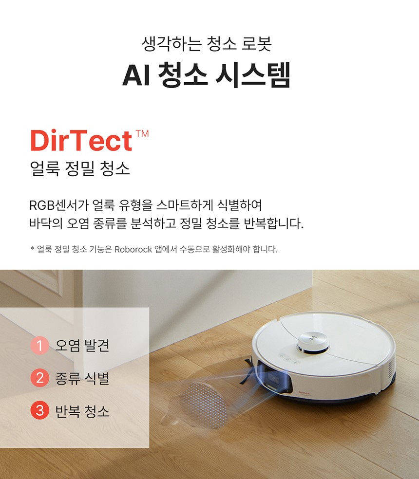 RGB 센서가 얼룩 유형을 식별하여 정밀 청소를 반복 수행합니다.
