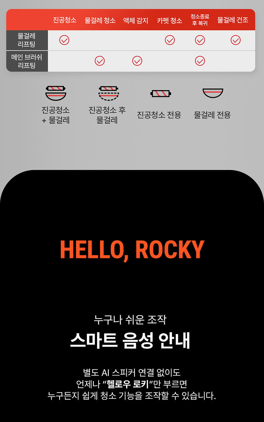 "헬로우 로키"라고 부르면 31가지 음성 명령으로 로봇청소기를 제어할 수 있습니다.