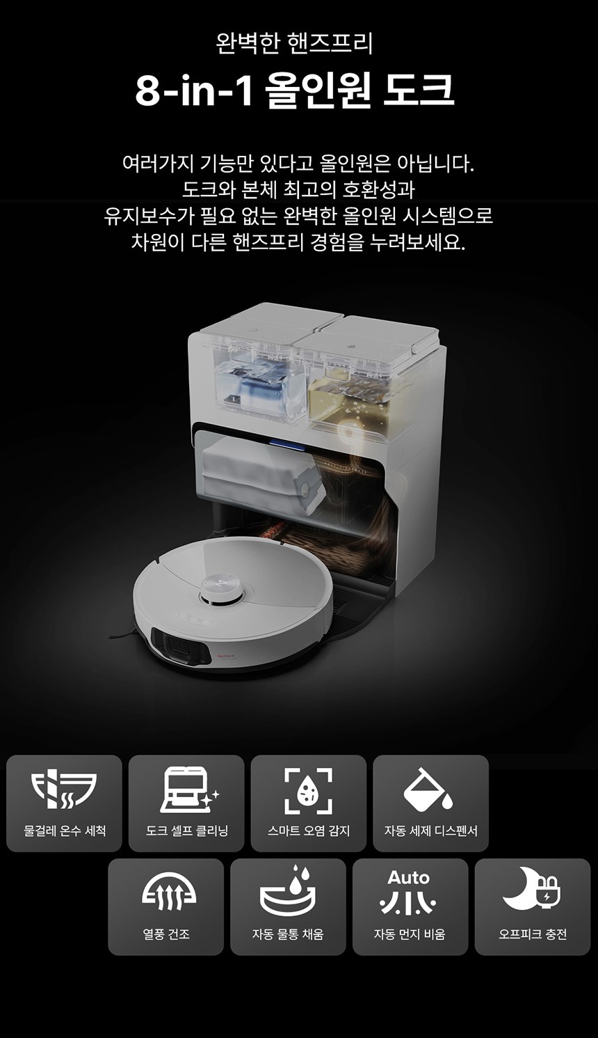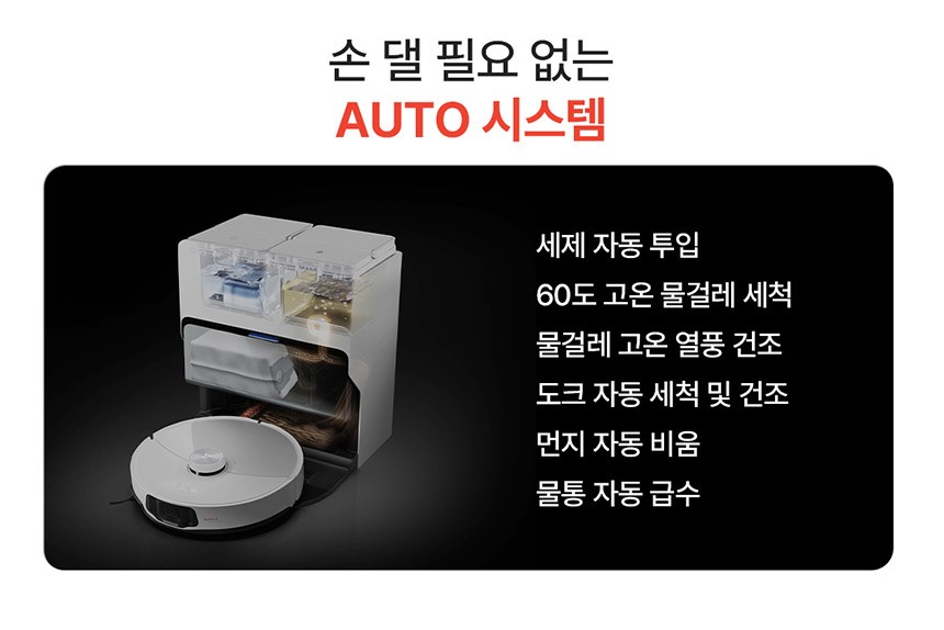 - 도크 자동 세척 및 건조: 청소가 끝나면 자동으로 도크를 세척하고 건조하여 항상 깨끗한 상태를 유지합니다.