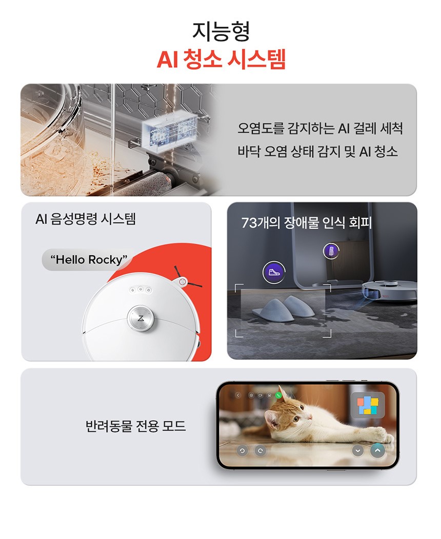 - AI 음성 명령: 73개의 장애물을 인식하고 회피하며, 음성으로 청소를 제어할 수 있습니다.