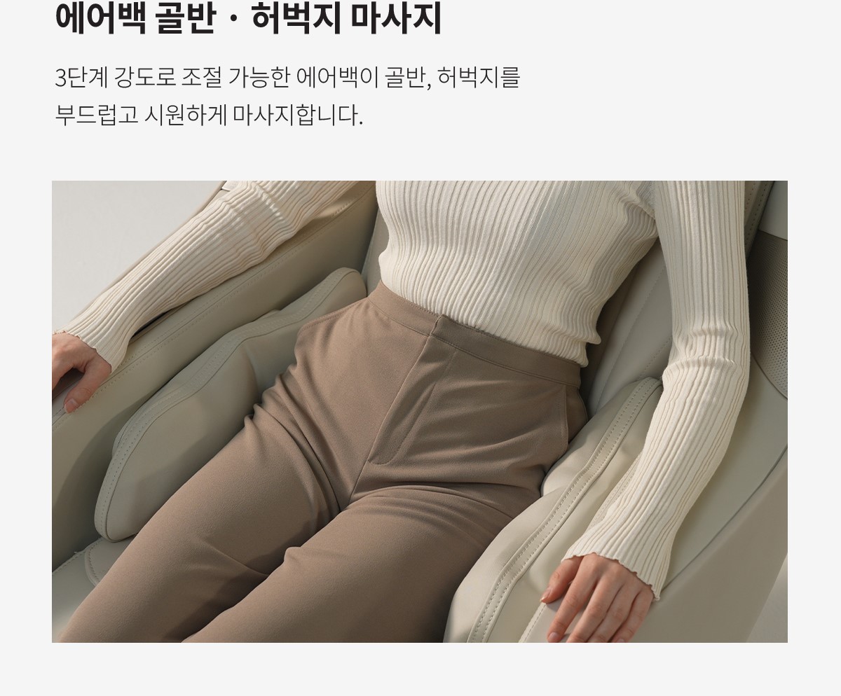 다리 마사지는 3단계 강도로 조절 가능한 에어셀 기술을 통해 이루어집니다. 에어셀이 반복적으로 팽창하고 수축하며 뭉친 다리를 시원하게 풀어주어 하체 피로를 효과적으로 완화합니다.