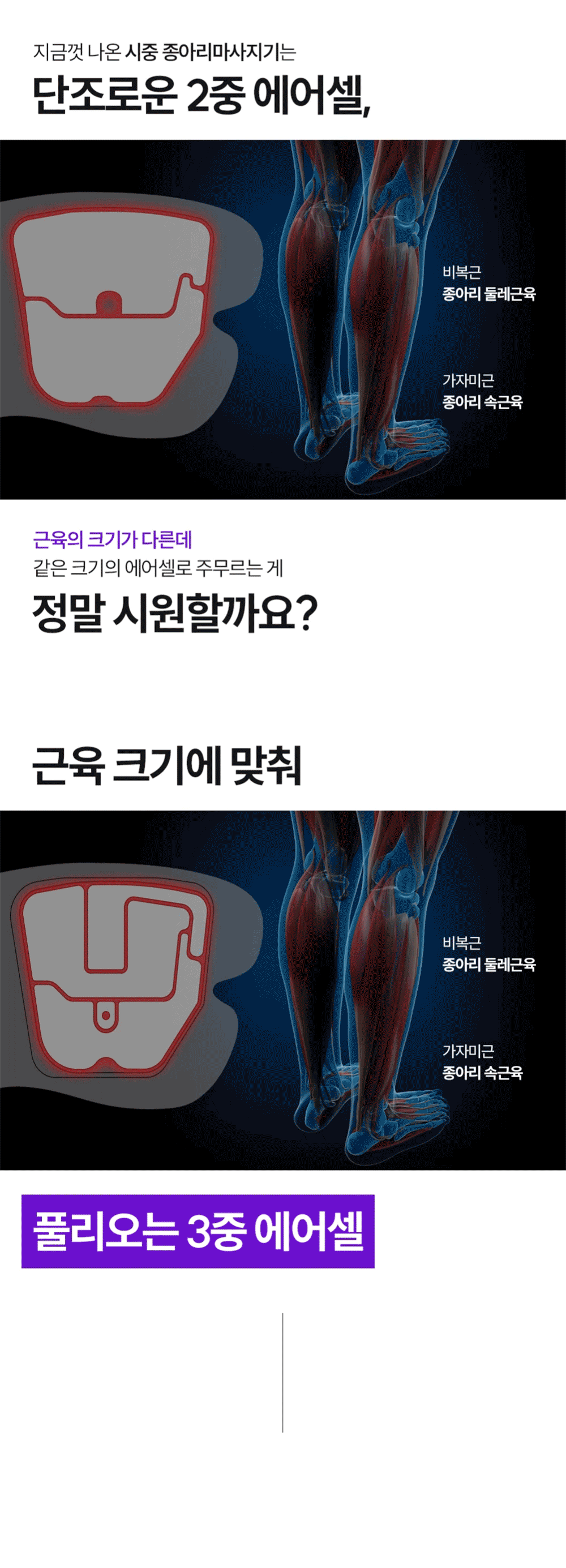 - 붓기 완화: 3중 에어셀의 입체적인 마사지는 종아리 붓기를 효과적으로 완화해줍니다.