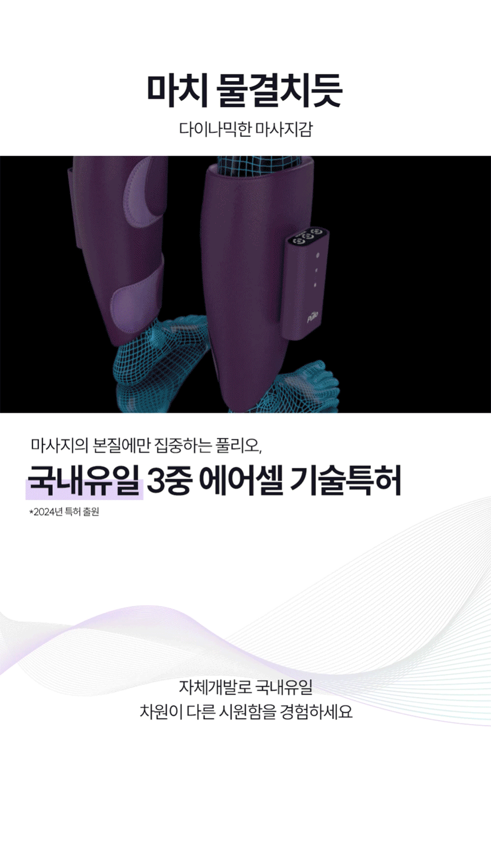 - 국내 유일의 특허 기술: 풀리오 V3는 3중 에어셀 기술로 2024년에 특허 출원되었습니다. 다른 제품과의 차별화된 기술력으로 한층 더 진보한 마사지감을 제공합니다.