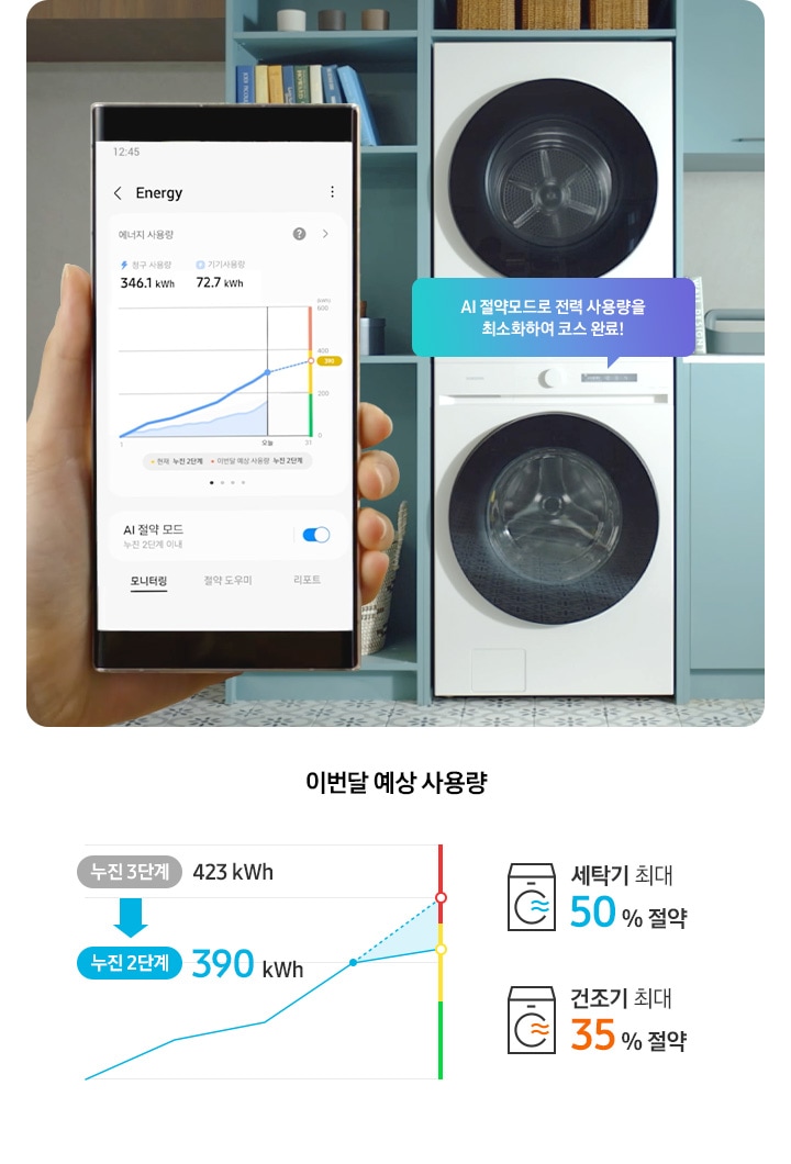 SmartThings 앱을 통해 AI 절약 모드를 설정하면 세탁기는 최대 50%, 건조기는 최대 35%까지 에너지 사용량을 절감할 수 있습니다. AI 에너지 절약 기능은 에너지 효율을 높여 전기료 부담을 덜어주고 환경 보호에도 기여합니다.