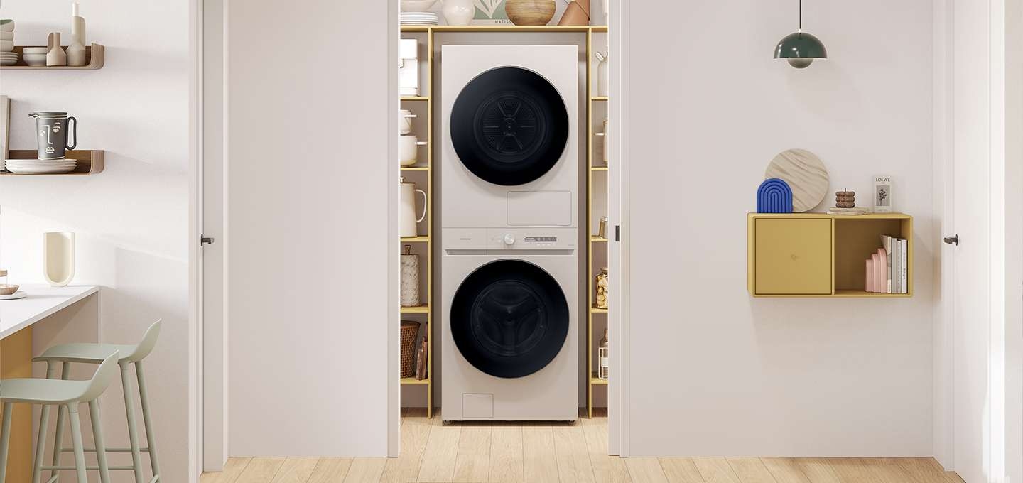 BESPOKE 그랑데 AI 원바디 Top-Fit은 플랫한 디자인과 컴팩트한 크기로 공간을 더욱 넓고 시원하게 만들어줍니다. 세탁실 뿐만 아니라 드레스룸, 욕실 등 다양한 공간에 설치하여 공간 활용도를 높일 수 있습니다.