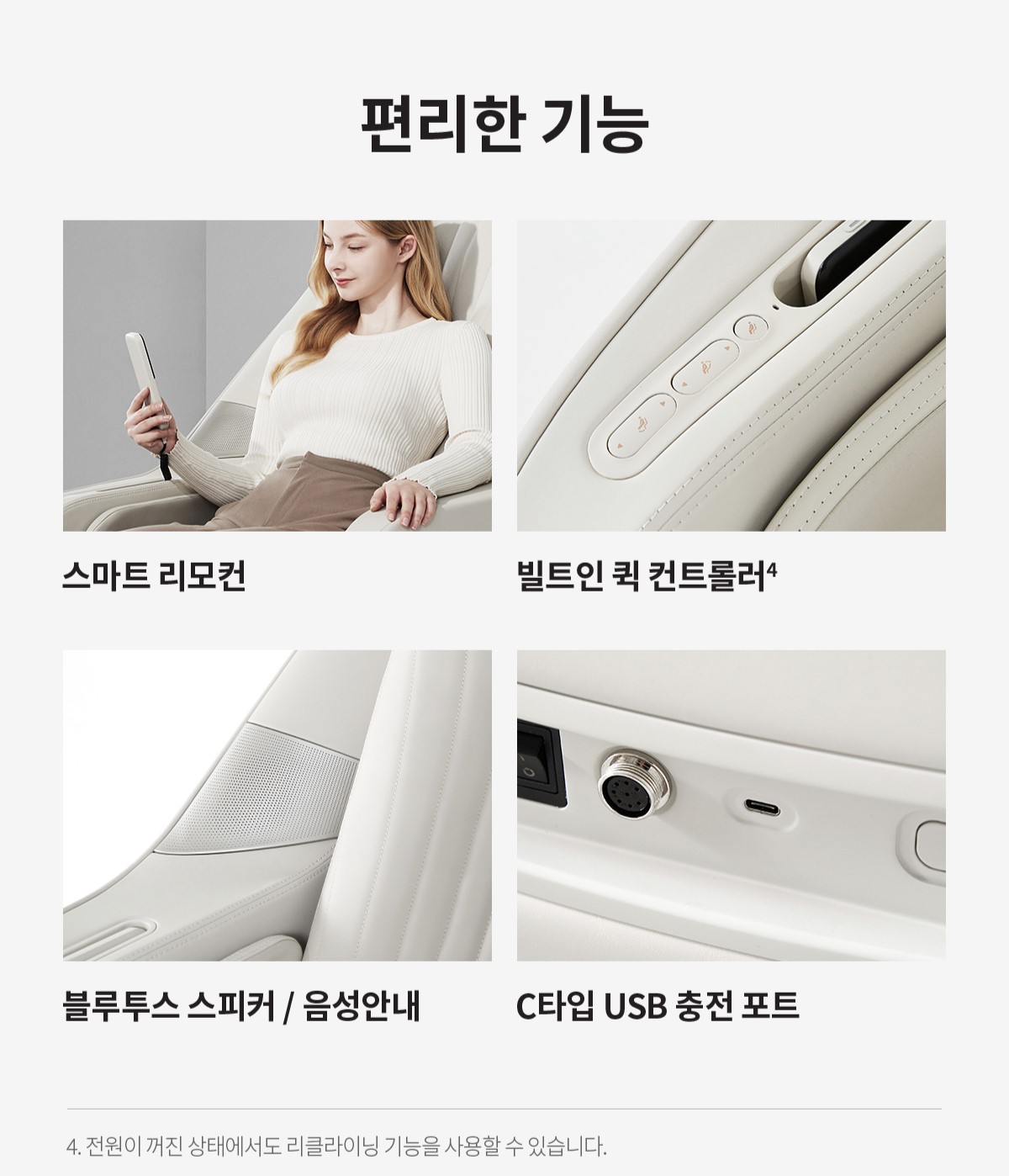 세라젬 파우제 M6는 다양한 스마트 기능을 탑재하여 사용자 경험을 극대화합니다. 스마트 리모컨과 빌트인 컨트롤러를 통해 직관적인 조작이 가능하며, C타입 USB 충전 포트와 블루투스 스피커 기능도 포함되어 있습니다. 이를 통해 마사지를 받는 동안 음악을 들으며 휴식을 취하거나, 스마트 기기를 충전할 수 있어 더욱 편리한 사용이 가능합니다. 또한 음성 안내 기능을 통해 사용자가 마사지를 시작할 때나 프로그램을 변경할 때 음성으로 안내를 받을 수 있어, 사용이 더욱 간편합니다. 이러한 스마트 기능들은 안마의자를 더욱 편리하게 사용하게 해주며, 사용자의 일상생활에 큰 편리함을 제공합니다.