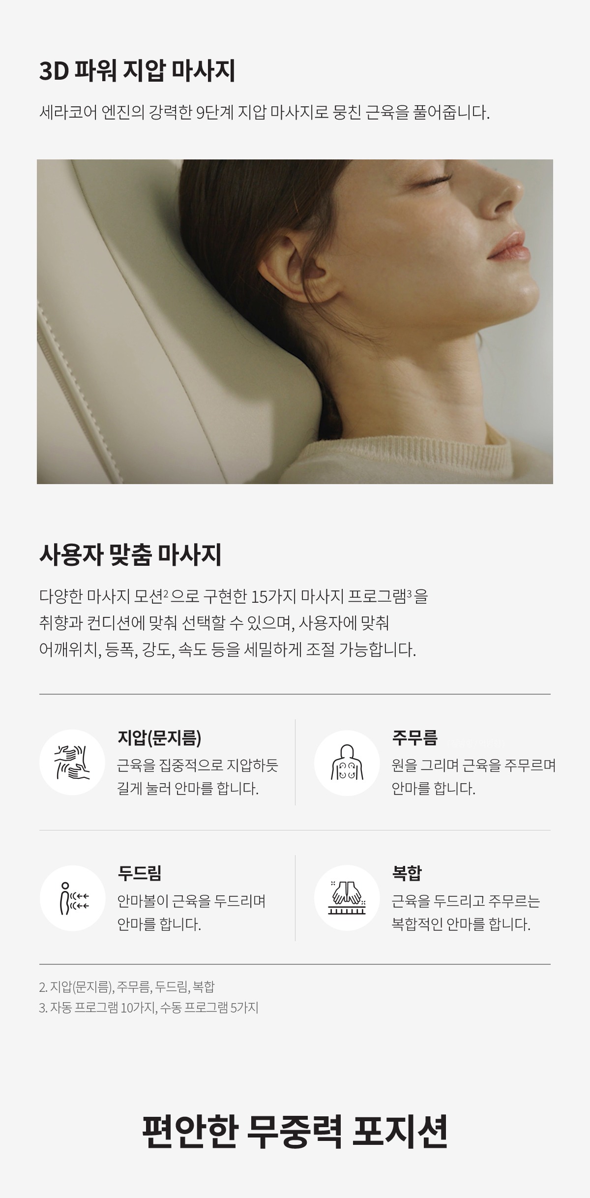 무중력 포지션은 세라젬 파우제 M6의 핵심 기능 중 하나로, 신체의 부담을 줄여주는 자세를 제공합니다. 체중이 골고루 분산되기 때문에 허리와 다리에 가해지는 압력을 최소화할 수 있습니다. 이로 인해 사용자는 마치 우주 공간에 있는 듯한 가벼움을 느끼며 마사지를 받을 수 있으며, 특히 허리 통증을 겪는 사용자들에게 매우 유용합니다.