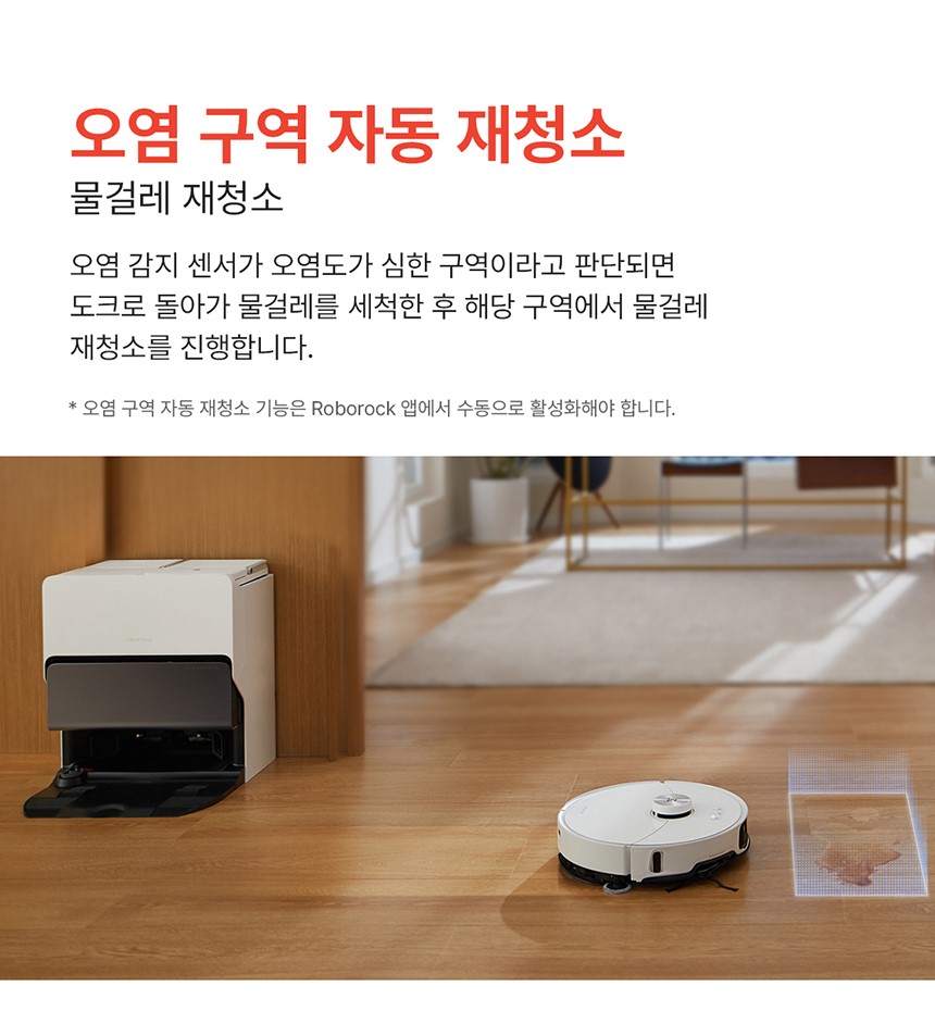 - 스마트 오염 감지: 물걸레 오염도를 감지하여 세척 시간을 조절합니다.