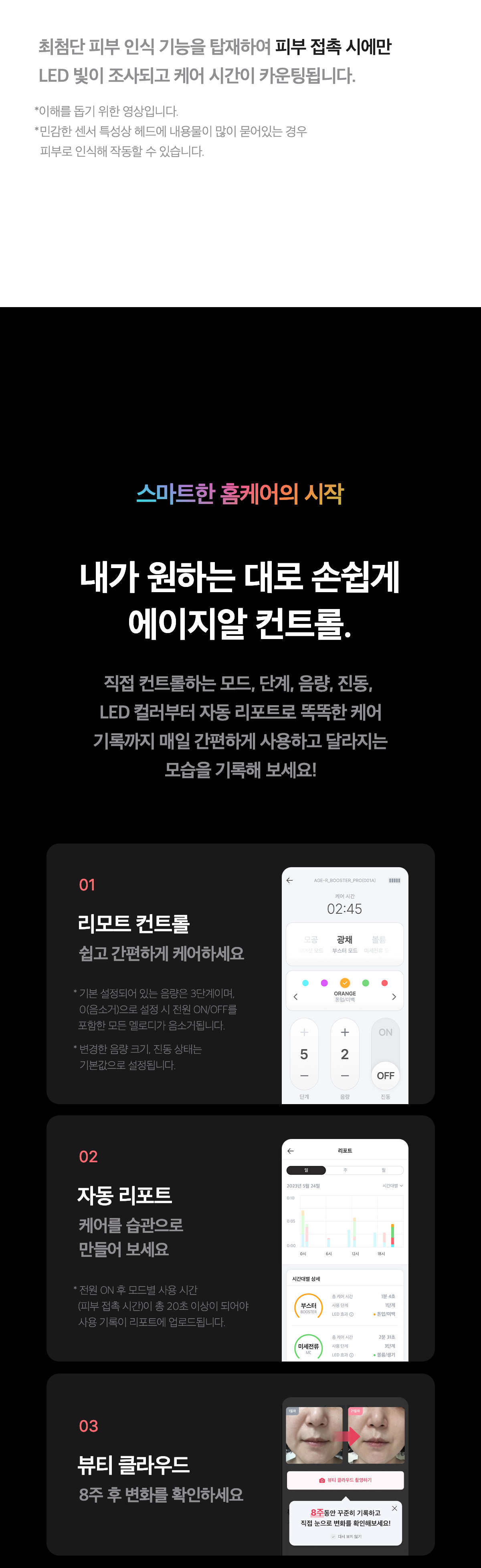 부스터 프로는 에이지알 전용 앱과 연동하여 더욱 스마트한 뷰티 라이프를 지원합니다. 앱을 통해 모드, 단계, 음량, 진동, LED 컬러 등을 간편하게 조절할 수 있으며, 자동 리포트 기능을 통해 체계적인 케어 기록 관리가 가능합니다. 특히, 뷰티 클라우드 기능은 8주간의 피부 변화를 기록하여 객관적인 피부 개선 효과를 확인할 수 있도록 돕습니다. 이러한 스마트한 기능들은 사용자의 편의성을 높이고, 꾸준한 피부 관리를 돕는 훌륭한 조력자 역할을 합니다. 이제는 앱을 통해 나만의 맞춤형 케어 루틴을 설정하고, 달라지는 피부를 직접 확인하며 즐거운 뷰티 라이프를 경험할 수 있습니다.