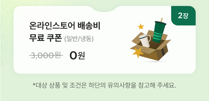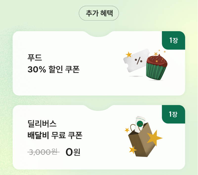 음료 할인 외에도 푸드 30% 할인 쿠폰 1장, 딜리버스 배달비 무료 쿠폰 1장, 온라인 스토어 배송비 무료 쿠폰 2장이 매월 제공됩니다. 스타벅스 푸드를 좋아하거나, 딜리버스 또는 온라인 스토어를 이용하는 분들에게는 더욱 매력적인 혜택입니다.