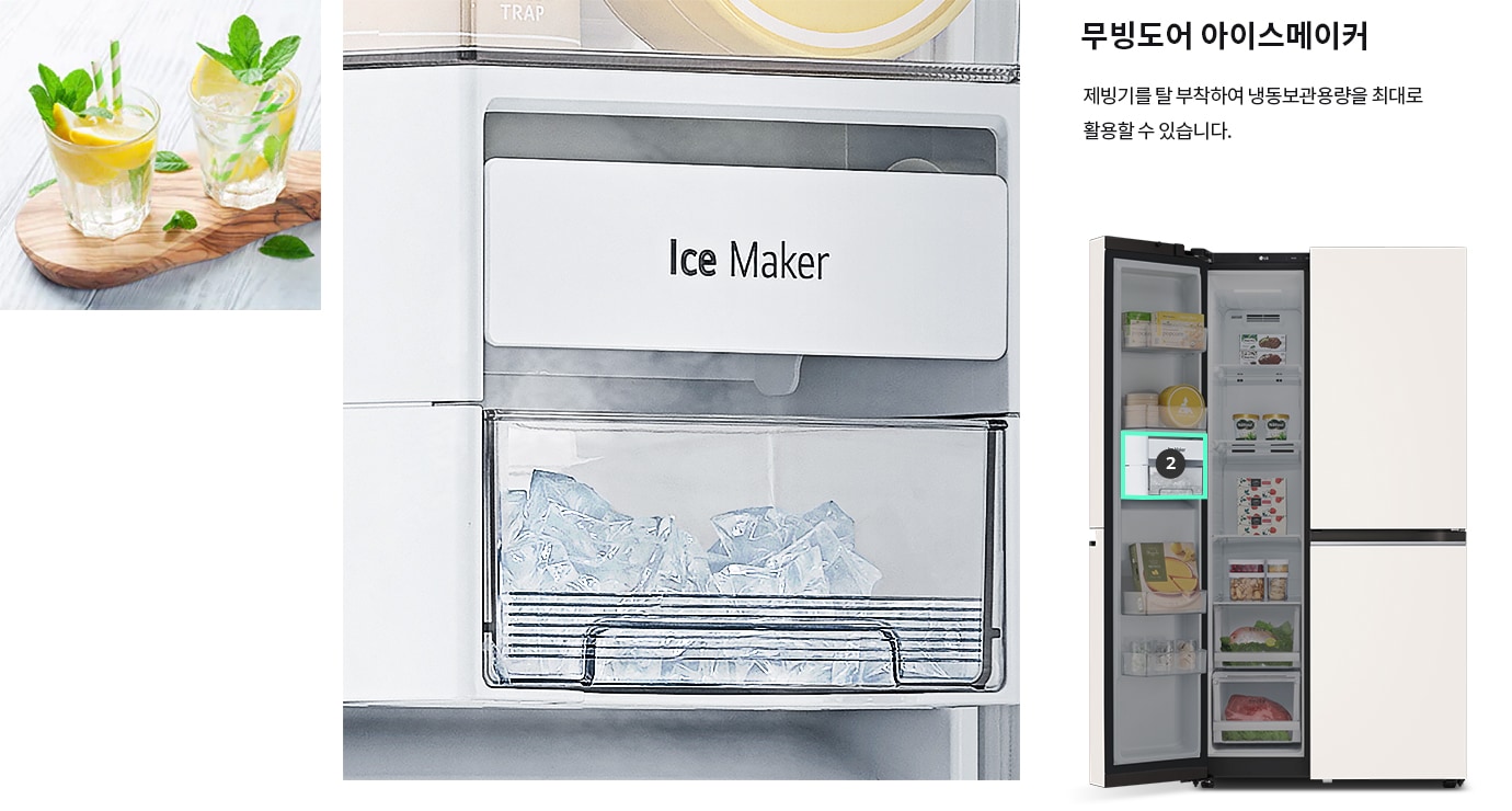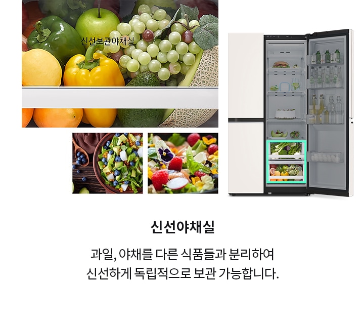 - 신선야채실: 과일과 야채를 신선하게 보관할 수 있는 전용 공간입니다. 습도 조절 기능으로 신선도를 오랫동안 유지하여 맛과 영양을 지켜줍니다.